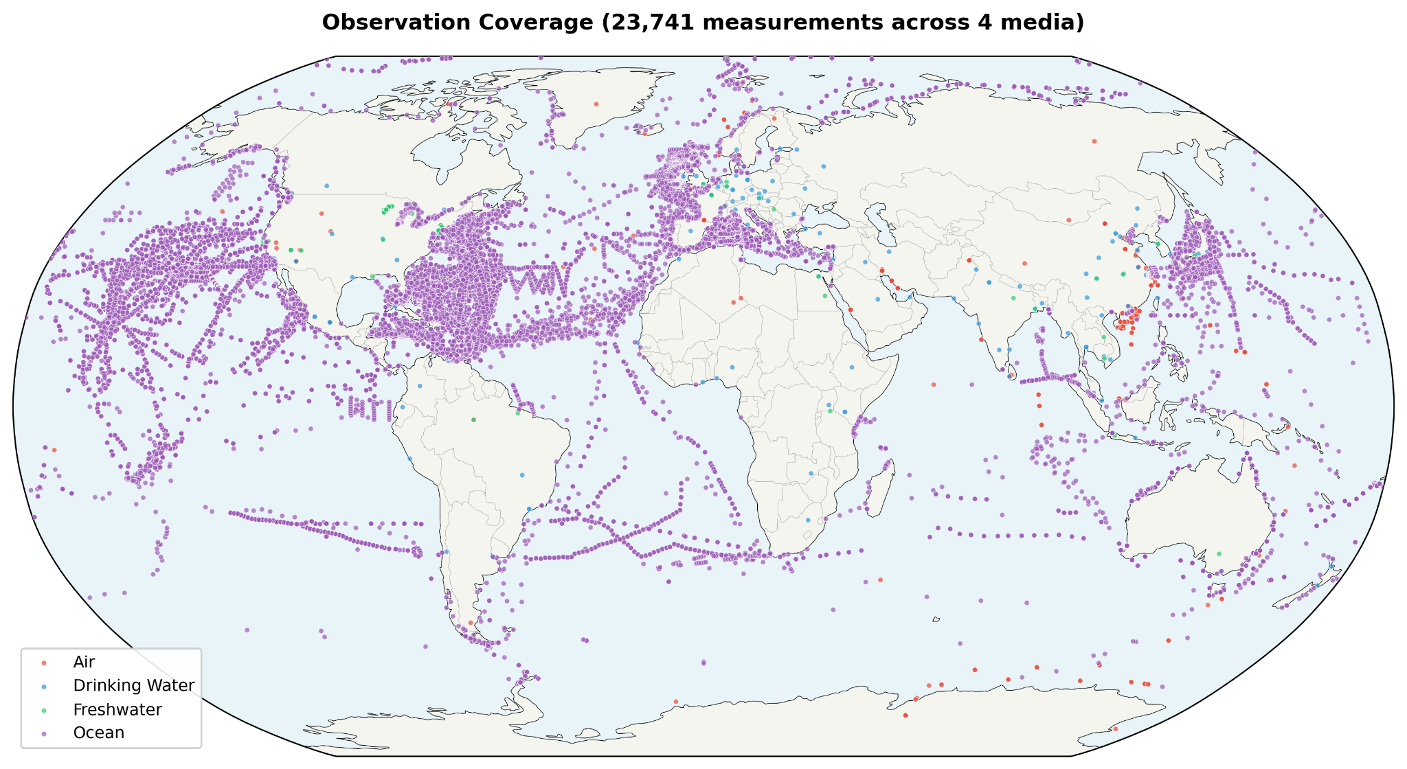The harmonized observation dataset contains 2,129 quality controlled measurements across 64 countries and three environmental media. Air contributes 247 observations across 24 countries, drawing primarily from Evangeliou et al. [6] and related literature compilations. Freshwater contributes 693 observations across 19 countries, dominated by USGS freshwater surveys [20]. Ocean contributes 1,189 observations across 50 countries, drawing from NOAA NCEI [21], Isobe et al. [9], Eriksen et al. [5], and additional literature sources. Twenty three countries have observations in more than one medium.