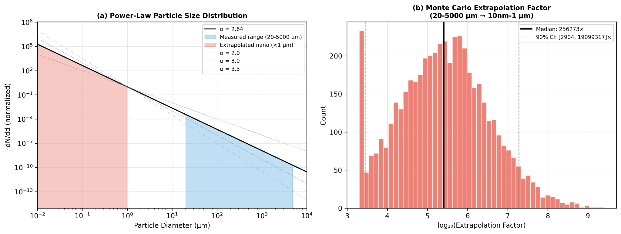 This is also one of the least certain parts of the model. The extrapolation factor is highly sensitive to the value of alpha, which means even modest changes in the assumed fragmentation slope can produce very large differences in estimated nanoplastic abundance. To reflect that, the model uses Monte Carlo simulation with alpha drawn from a truncated normal distribution centered at 2.64, with sigma 0.35 and bounds from 2.0 to 4.0. Under that approach, the 90% confidence interval spans roughly 3 to 4 orders of magnitude. That is not a small caveat. It is a direct acknowledgment that nanoplastic abundance remains one of the major unresolved uncertainties in the field.