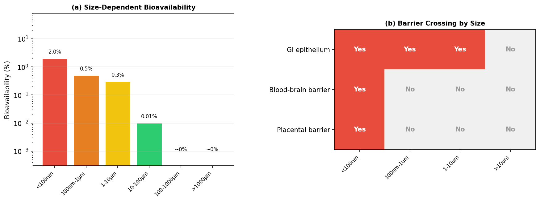 Ingestion is modeled through freshwater and ocean linked pathways, along with the share of inhaled particles that are eventually cleared into the GI tract. Once particles reach the gastrointestinal system, the relevant question becomes bioavailability: what fraction crosses the gut barrier rather than simply passing through. Here again, size does much of the work. The model does not assume that all ingested particles are absorbed. It assumes that most are not, and that the smallest particles are disproportionately important.