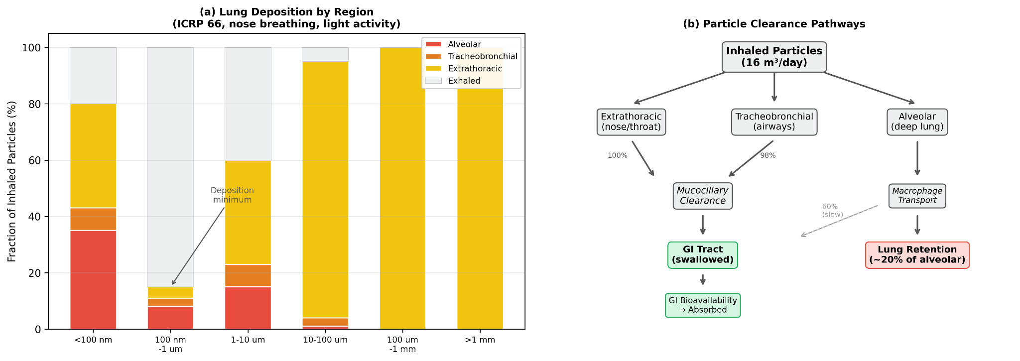 The clearance assumptions are explicit. Extrathoracic deposition is treated as 100% swallowed to the GI tract. Tracheobronchial deposition is treated as 98% cleared to the GI tract via the mucociliary escalator, with a half life of roughly 2 to 24 hours. Alveolar deposition is treated as 60% cleared to the GI tract through macrophage mediated transport, 20% permanently retained in lung tissue, and 20% diverted to lymph nodes. These are simplifying assumptions, but they allow the model to separate temporary passage from longer term tissue burden rather than collapsing inhalation into a single number.