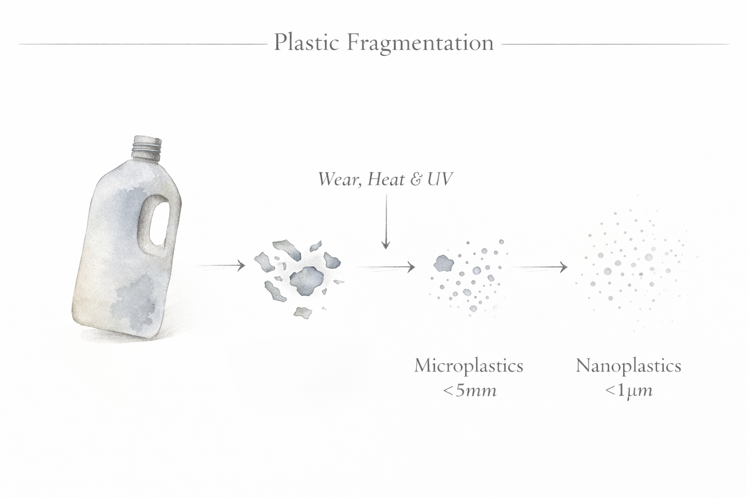 - Secondary microplastics: Fragments formed when larger plastic items break down over time. Heat, friction, sunlight, and everyday wear cause bottles, packaging, textiles, and household plastics to shed progressively smaller pieces. This is now the dominant source of microplastics found in food and drinking water.