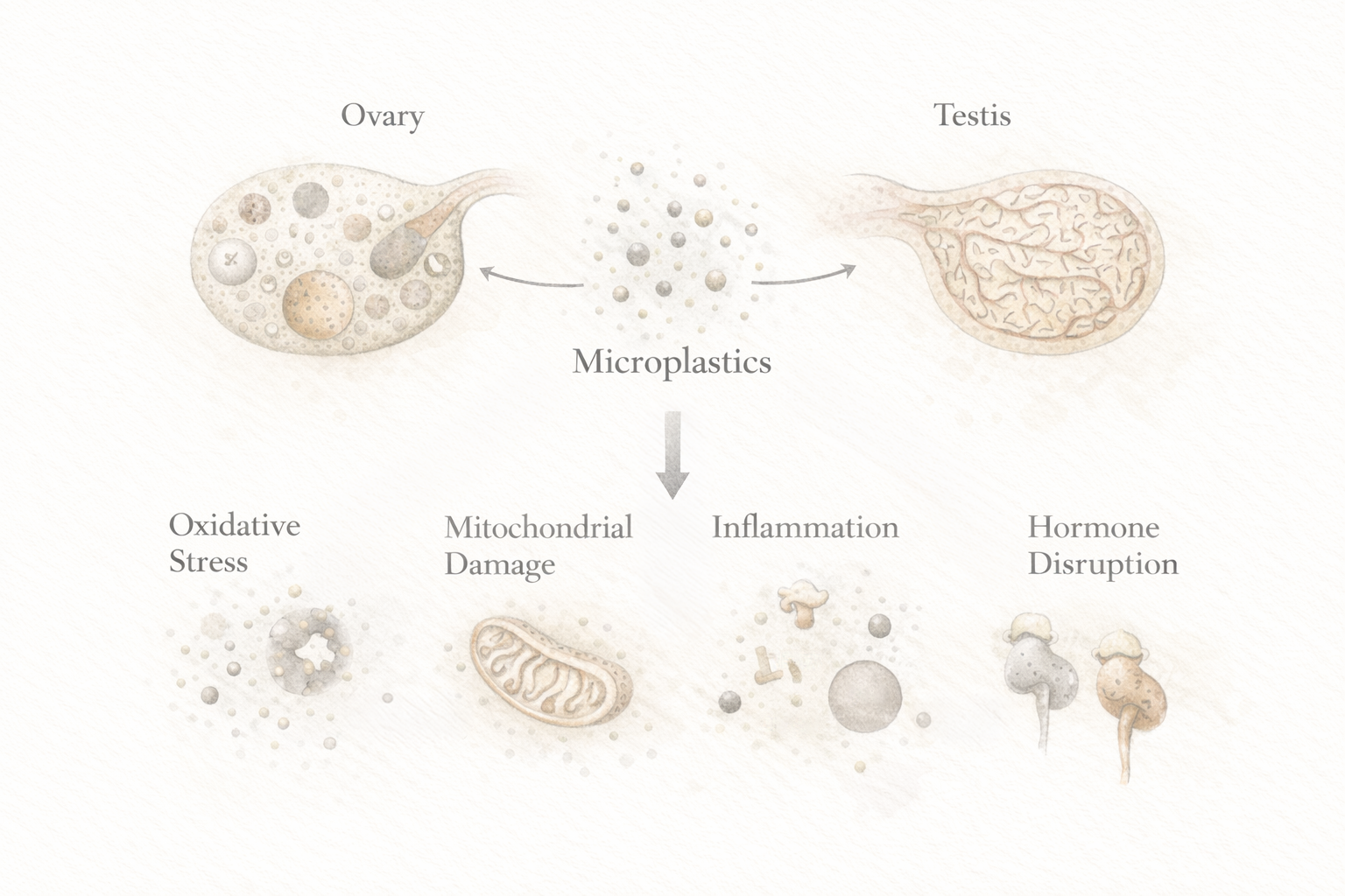 - A 2021 study found that 90 days of exposure to polystyrene nanoplastics led to significant ovarian damage [3]. The particles entered ovarian granulosa cells, reduced the number of developing follicles, and lowered levels of anti-Müllerian hormone (AMH), indicating reduced ovarian reserve.