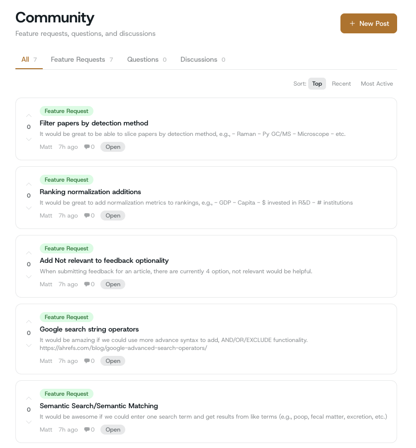 The Community page is where people can ask questions, submit feature requests, and propose corrections.