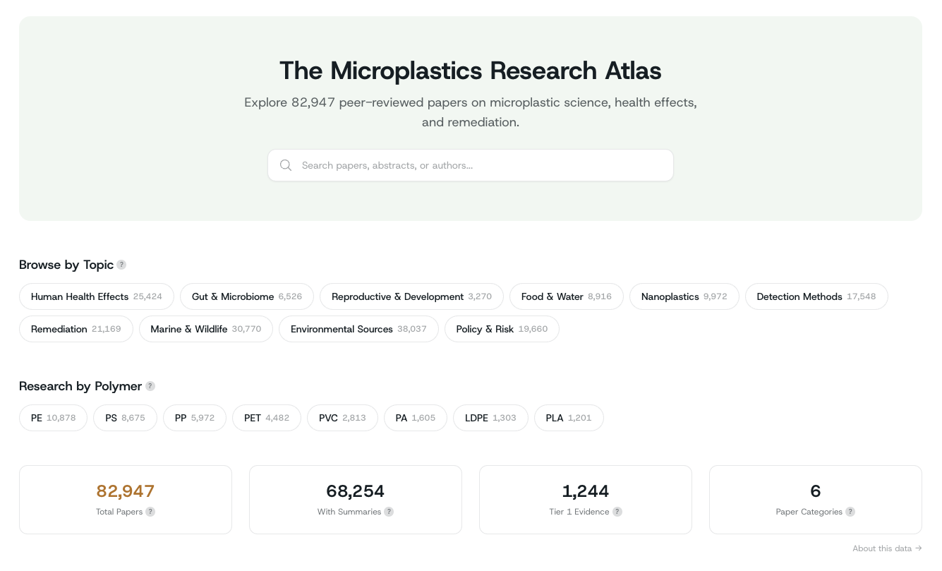 That is why we built the Winnow Atlas. Atlas is our research index for the microplastics literature: a structured way to explore the field, surface patterns, and make it easier for researchers, policymakers, practitioners, and curious readers to find the papers that matter. Today, Atlas indexes 82,947 peer reviewed papers, with 68,254 plain language summaries, and updates as new literature is added.