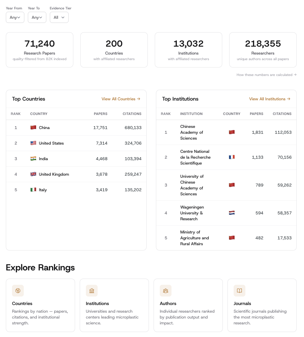 The rankings can be filtered by year range and evidence tier, and are designed to help users see who is publishing, where the field is growing, and which institutions are contributing most heavily to the literature. The page currently shows 71,240 quality filtered research papers, 200 countries, 13,032 institutions, and 218,355 researchers represented in the dataset.