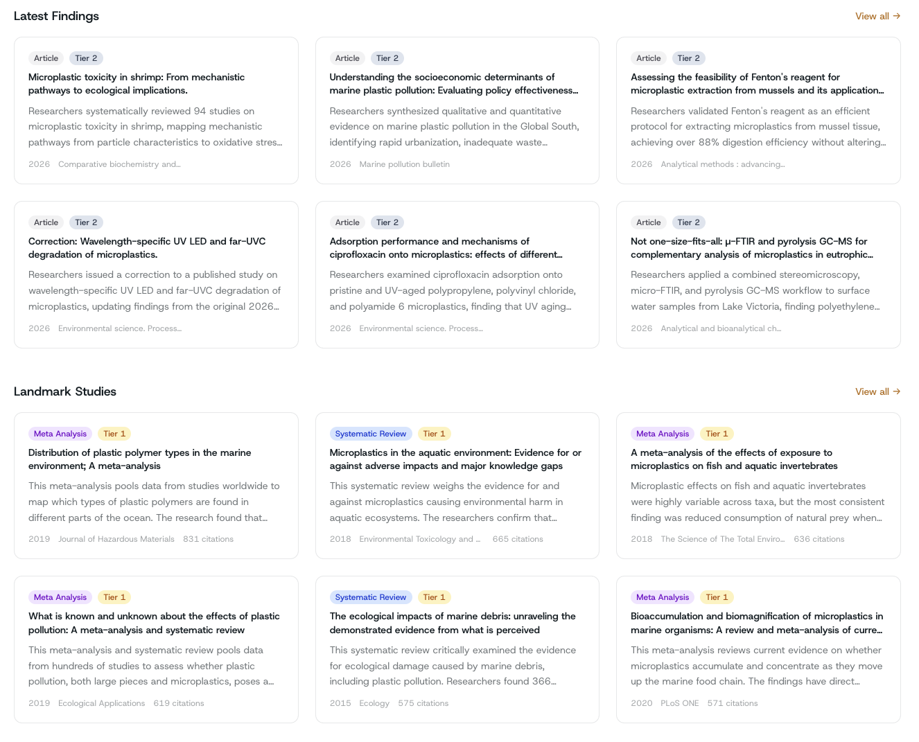 You can browse by major topic areas such as Human Health Effects, Gut & Microbiome, Reproductive & Development, Food & Water, Nanoplastics, Detection Methods, Remediation, Marine & Wildlife, Environmental Sources, and Policy & Risk. You can also explore the literature by polymer, see how many papers are in the corpus, how many have summaries, and how many fall into the highest evidence tier. The home page also highlights Latest Findings and Landmark Studies, so you can move quickly between what is new and what is foundational.